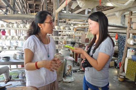 《国宝档案》栏目组编导陶梦清在古窑的手工制瓷作坊内接受景德镇媒体的采访
