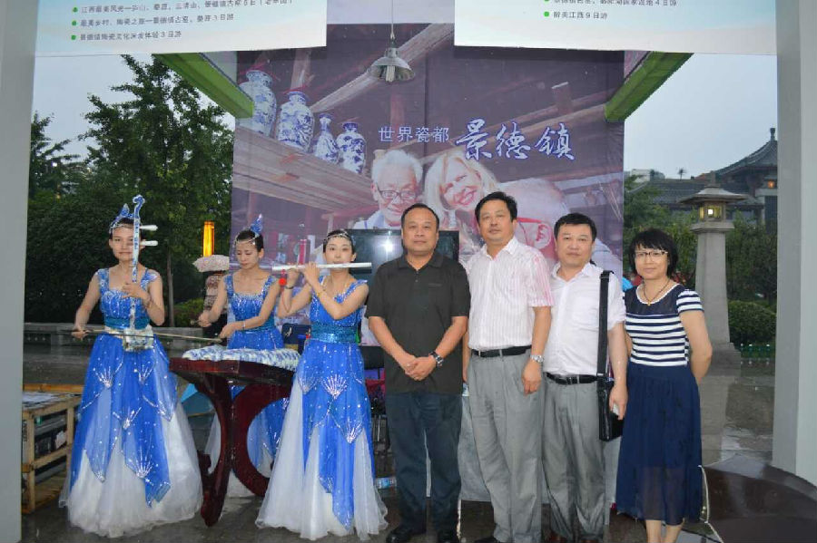 景德镇市副市长熊皓(中1)、景德镇市旅游局局长尧宁生(中2)与古窑景区代表团、紫晶国际旅行社负责人合影留念