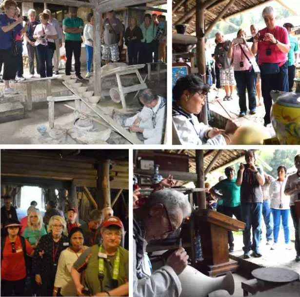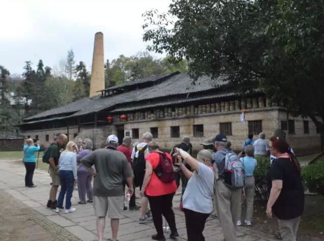 上午11时左右,满载着两百余名美国游客的7辆大巴车驶入古窑民俗博览区停车场,而此时,一辆来自德国的奔驰牌大房车也刚刚到达。游客们纷纷下车,向古窑景区大门走来,一座充满了古色古香的老窑房建筑进入他们的视线,也让他们顿时“惊呆”了,甚至连充满陶瓷特色的厕所都让游客们倍感惊喜,纷纷竖起大拇指称赞。古窑路边由碎瓷片、瓷瓶等装饰的矮墙引起了立刻吸引了游客们的注意,他们一边认真倾听了导游的讲解,一边按下相机的快门记录这些美丽的剪影。