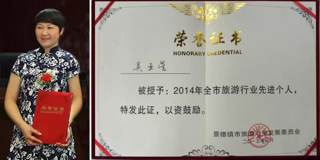 古窑-2014年全市旅游行业先进集体荣誉称号古窑吴亚星-2014年全市旅游行业先进个人荣誉称号