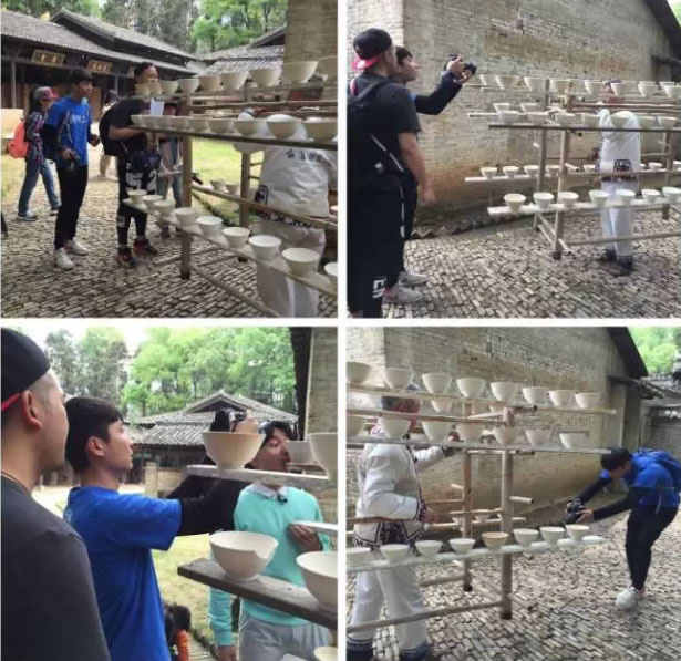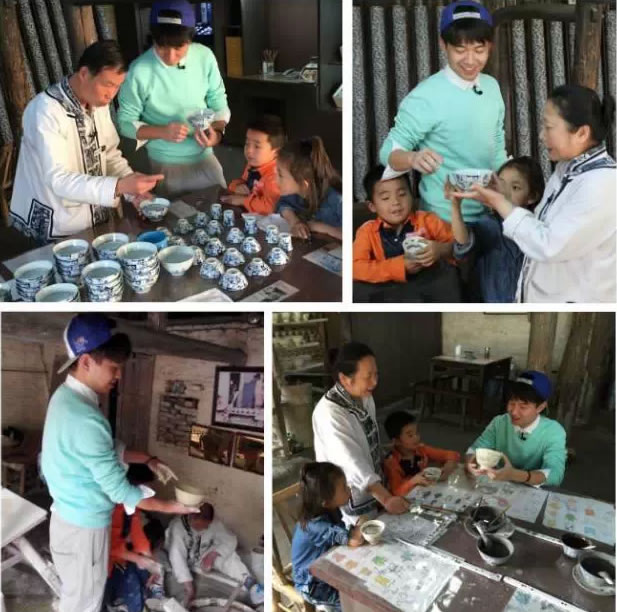 这么惊险的一幕着实让大家吓了一跳,也让他们对瓷器制作更加的好奇。在挑坯老艺人的指引下,大家来到手工制瓷作坊,学习陶瓷文化知识和传统手工制瓷技艺。在征得老艺人的同意后,“小虎哥哥”和小调查员们体验了揉泥、拉坯、施釉等制作工序,无奈难度太高均以失败告终。在画坯环节,老艺人细心地指导大家如何在瓷碗上画画,于是三只定制版的碗坯就这么诞生啦!欣喜之余,却被告知画好的碗坯要经过烧制才能成为真正的碗,大家都非常地失望。为了安抚失望的心情,老艺人答应赠送一只老茶花碗,这才平抚了大家的心情。