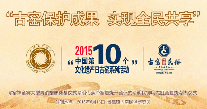 2015年文化遗产日的主题为“保护成果全民共享”,文化部、国家文物局将继续围绕此次主题举办丰富多彩的文化遗产日系列活动。古窑民俗博览区为了庆祝第十个中国文化遗产日,弘扬以童宾敬业、献身为核心的中国陶瓷精神,于2015年6月13日启动窑神童宾大型青铜塑像奠基仪式,同时还有明代葫芦窑复烧开窑仪式、明代御用龙缸窑复烧点火仪式等主题活动。全力践行,契合实际提出的“古窑保护成果,实现全民共享”的行动口号,以实际行动践行保护成果,让广大人民群众共享复建复烧历代传统窑炉、传承保护传统陶瓷文化的成果。